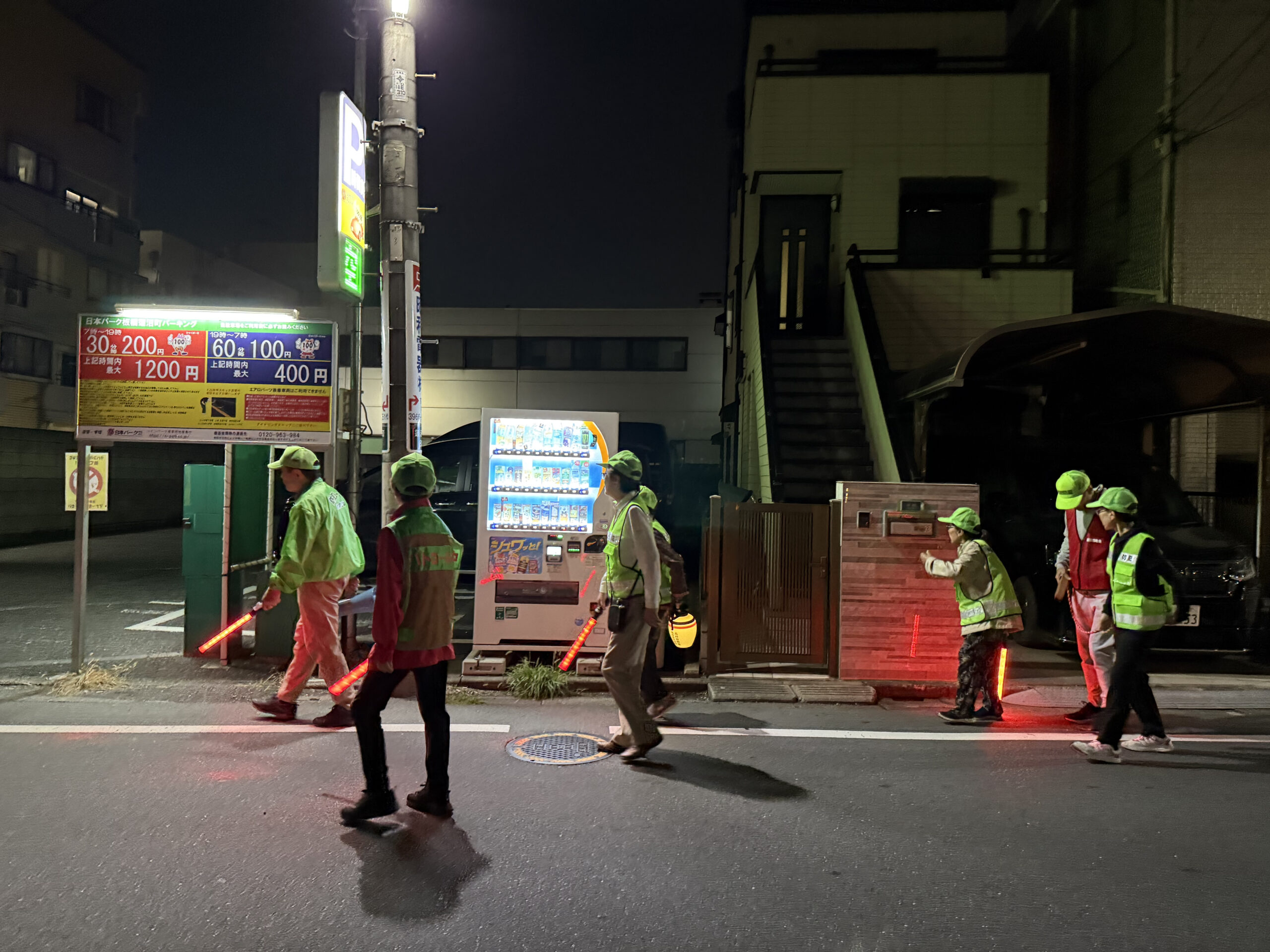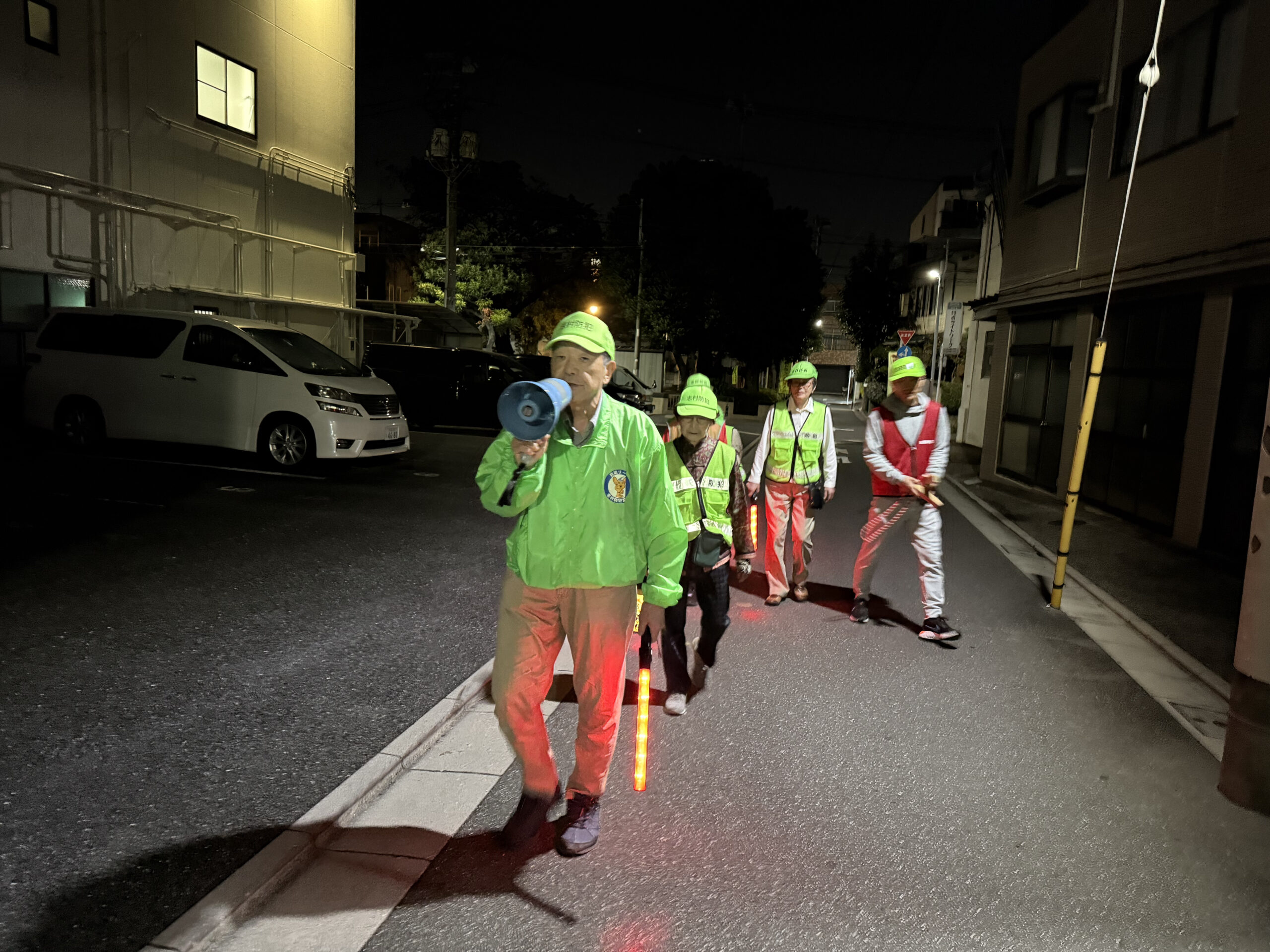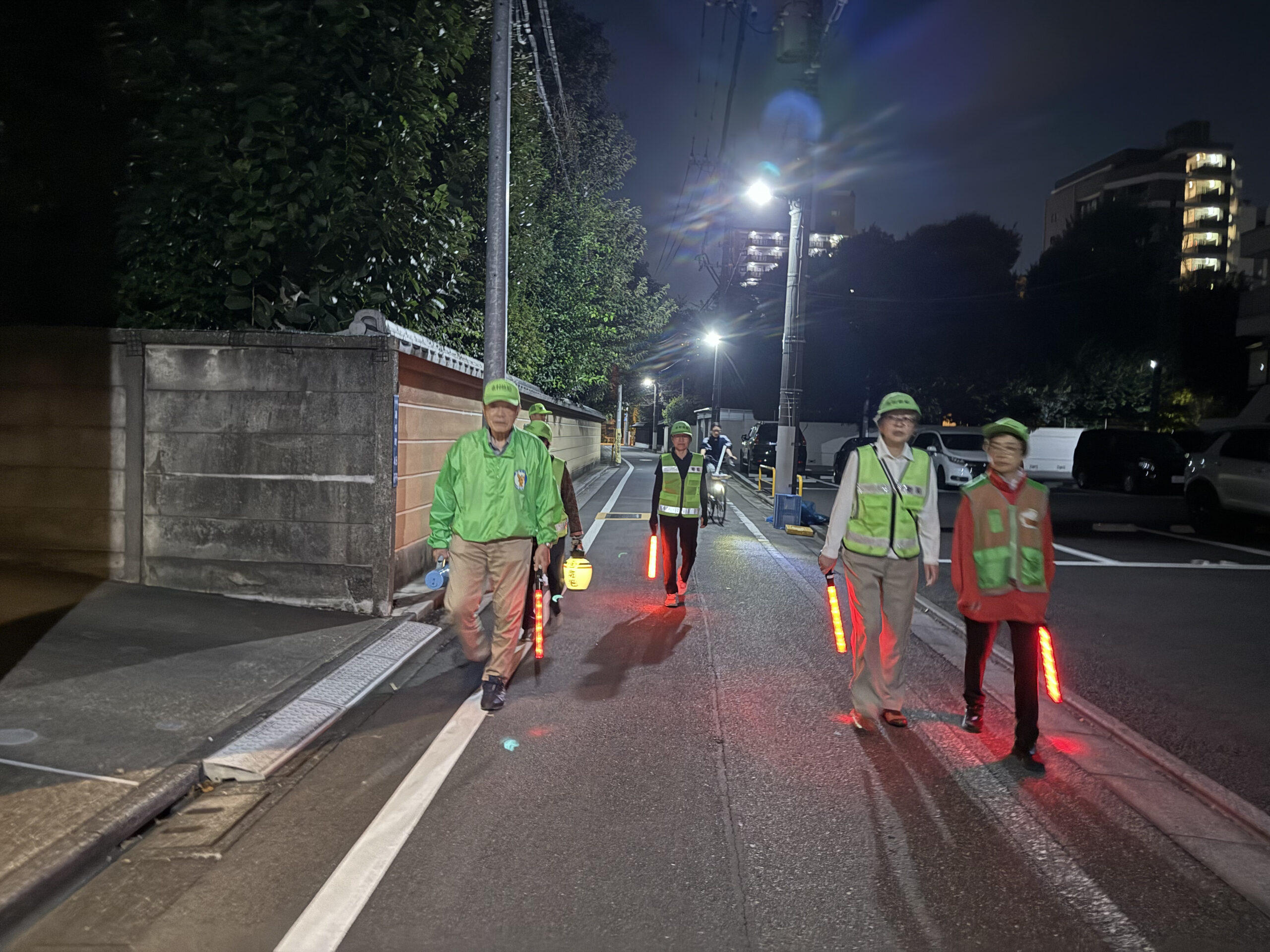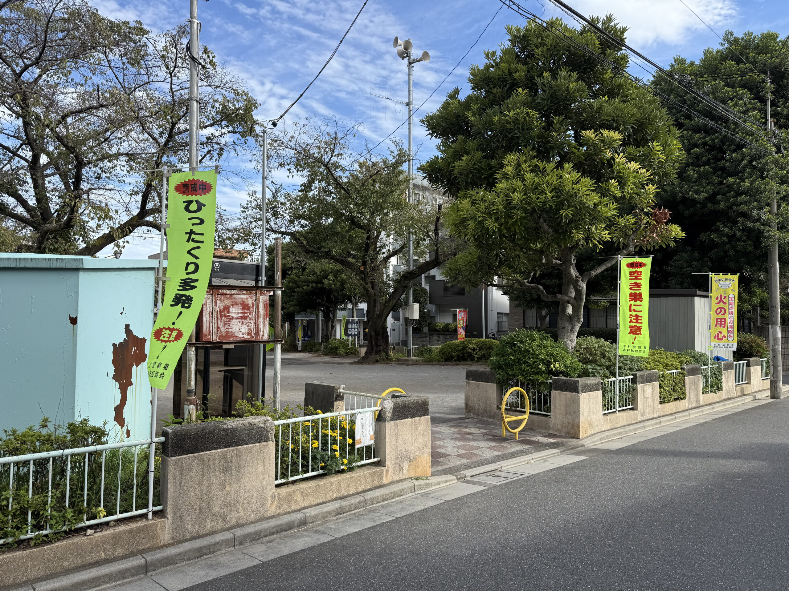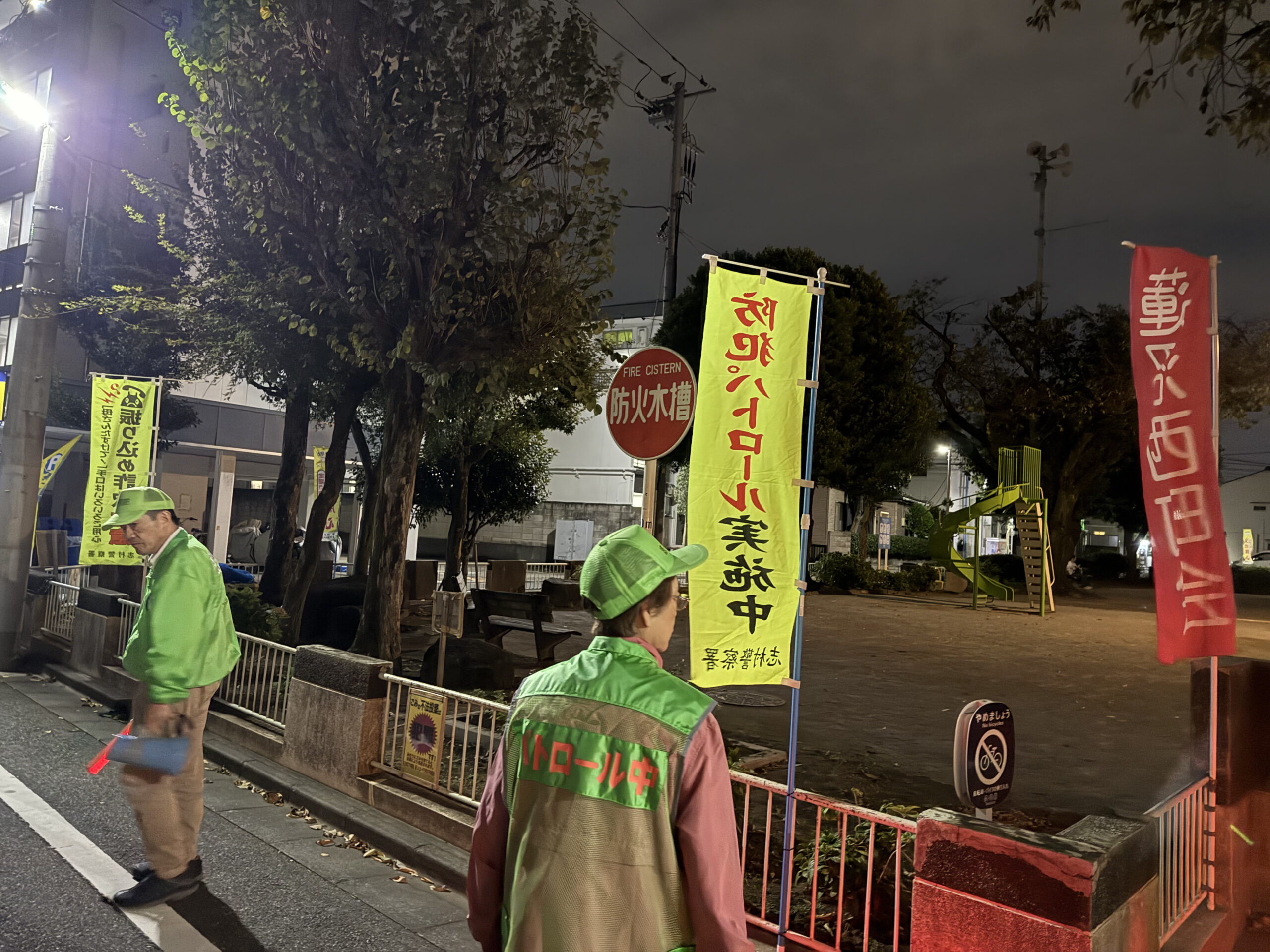 当町会としては、蓮沼公園のまわりに防犯のぼり旗を掲げ、17日、18日に防犯パトロールを実施しました。19日は雨模様のため中止しました。