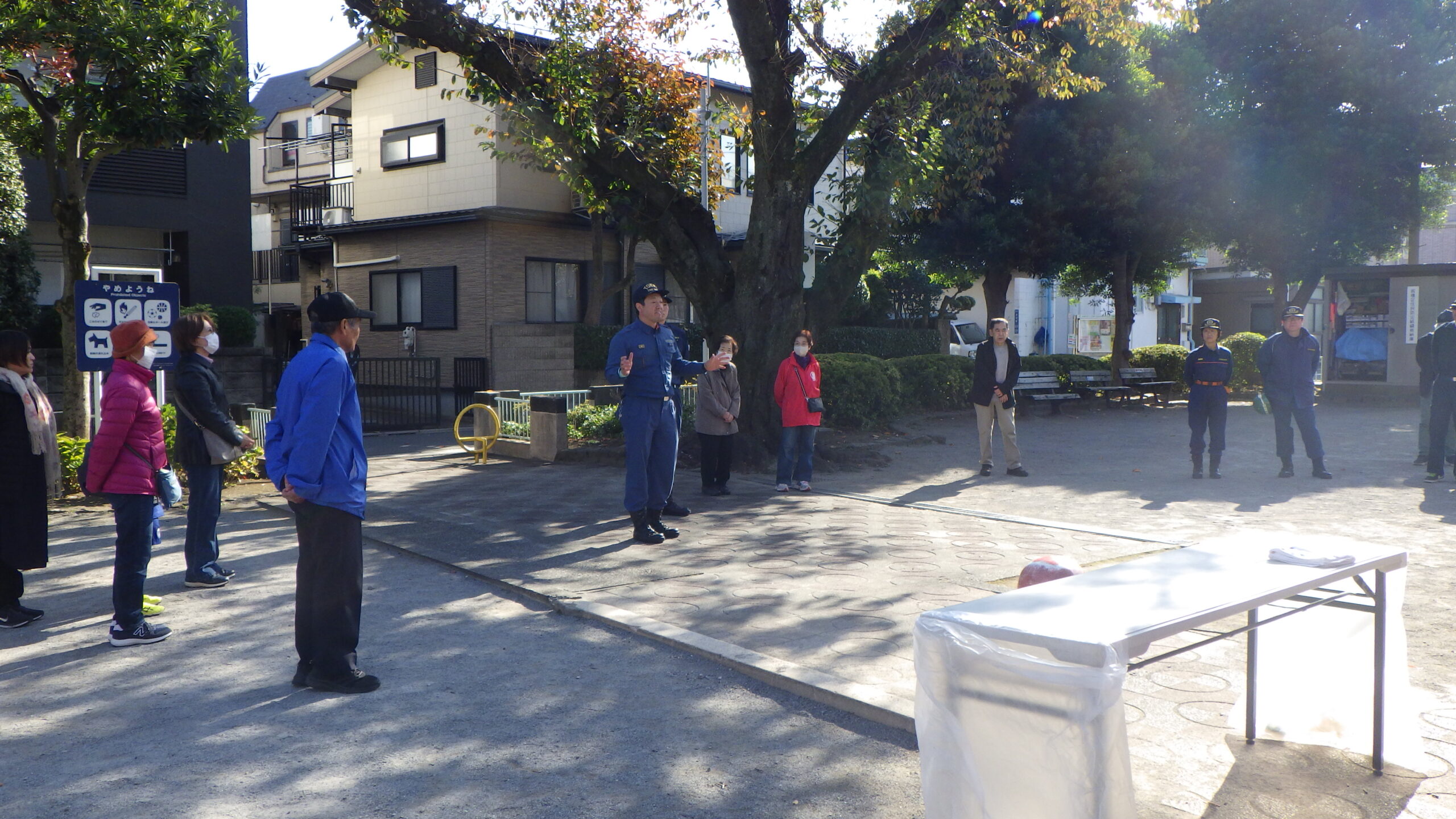 11月16日(日)、秋晴れの午前10時より蓮沼公園にて当町会の防災訓練は開始されました。