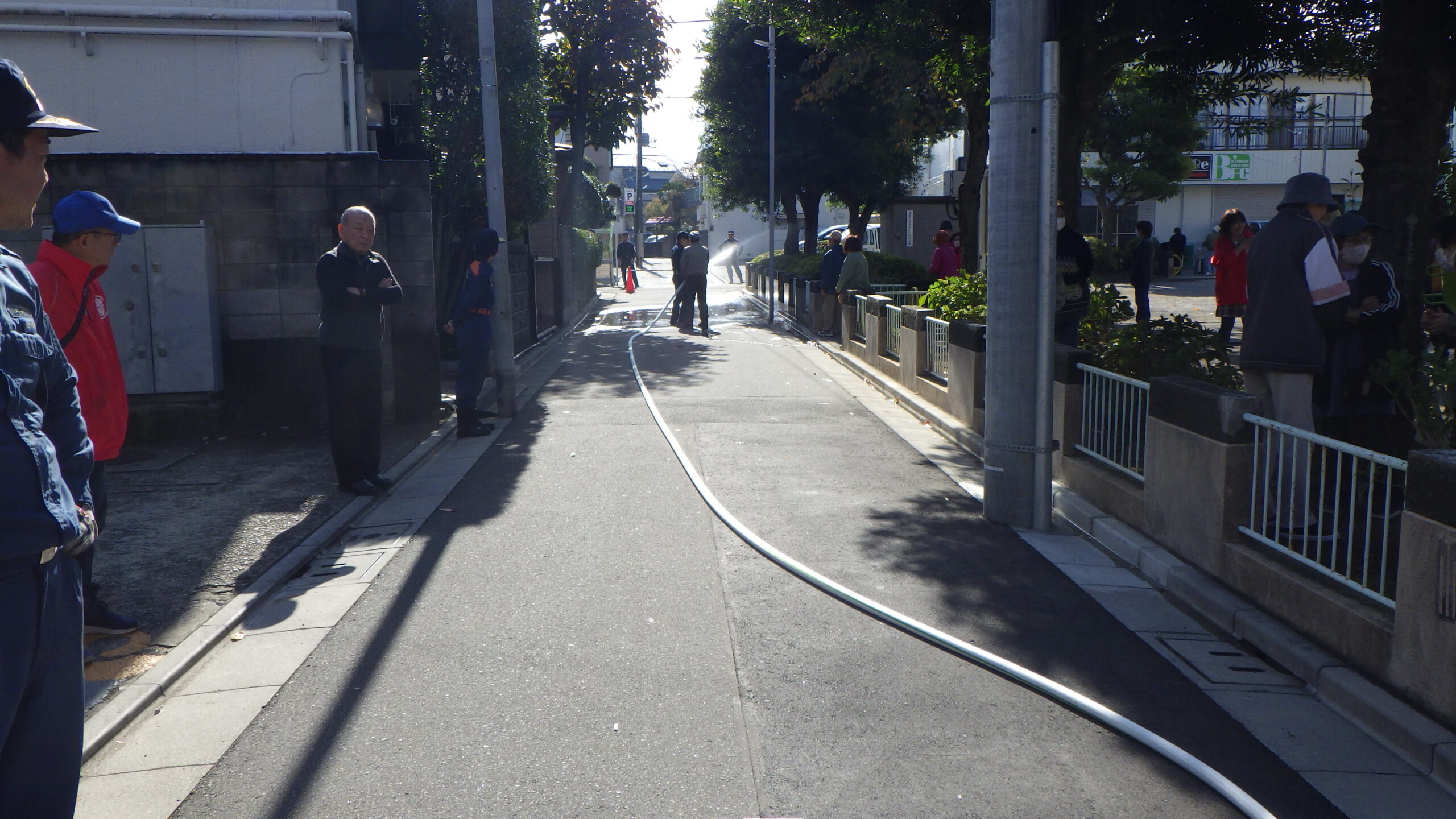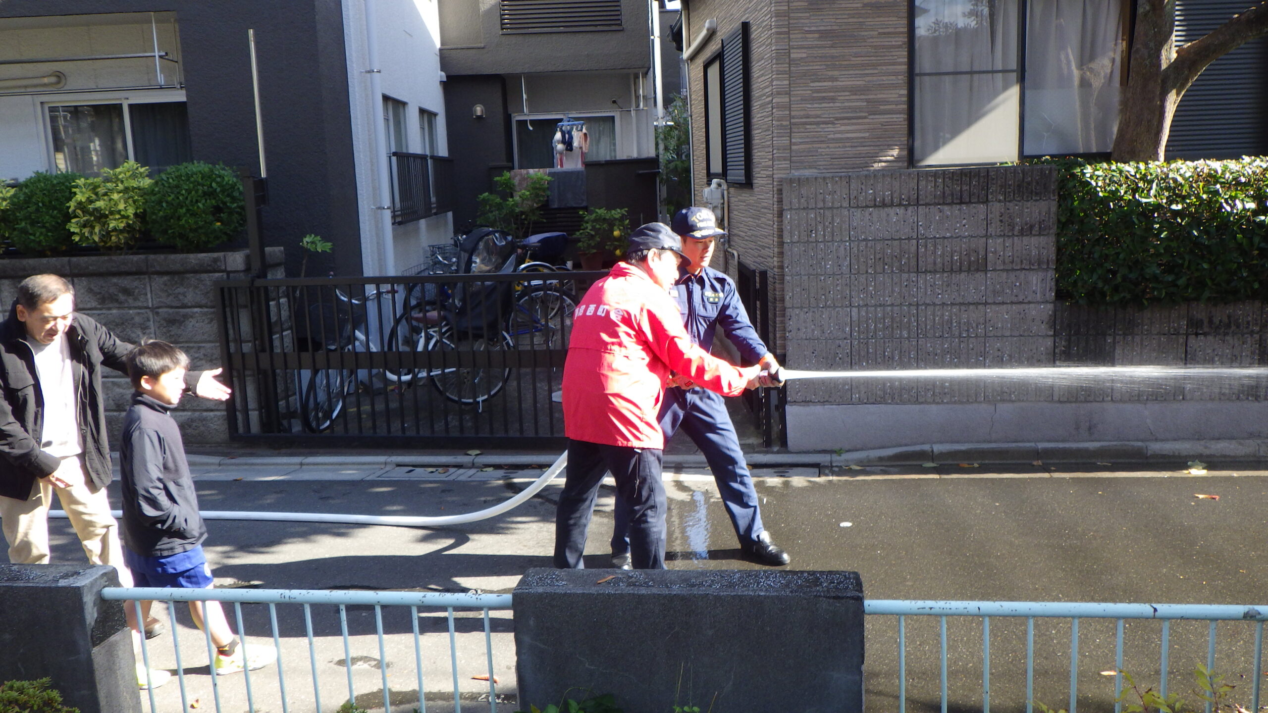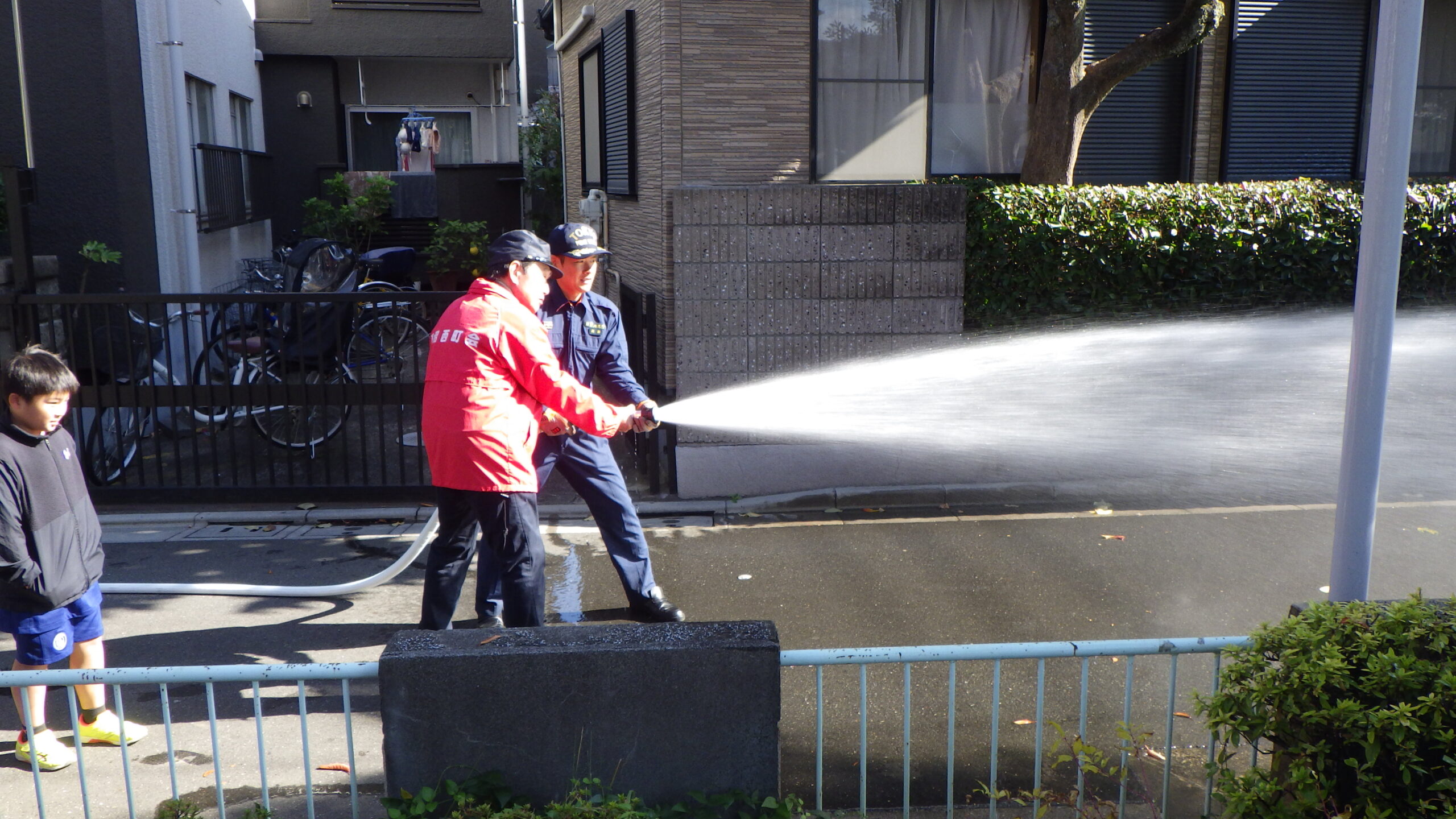 訓練は例年通りのAED(自動体外式除細動器)を使用した応急手当、水消火器を使用した初期消火訓練のほか、本年はスタンドパイプによる放水訓練を実施。これはかなり訓練らしいものでした。