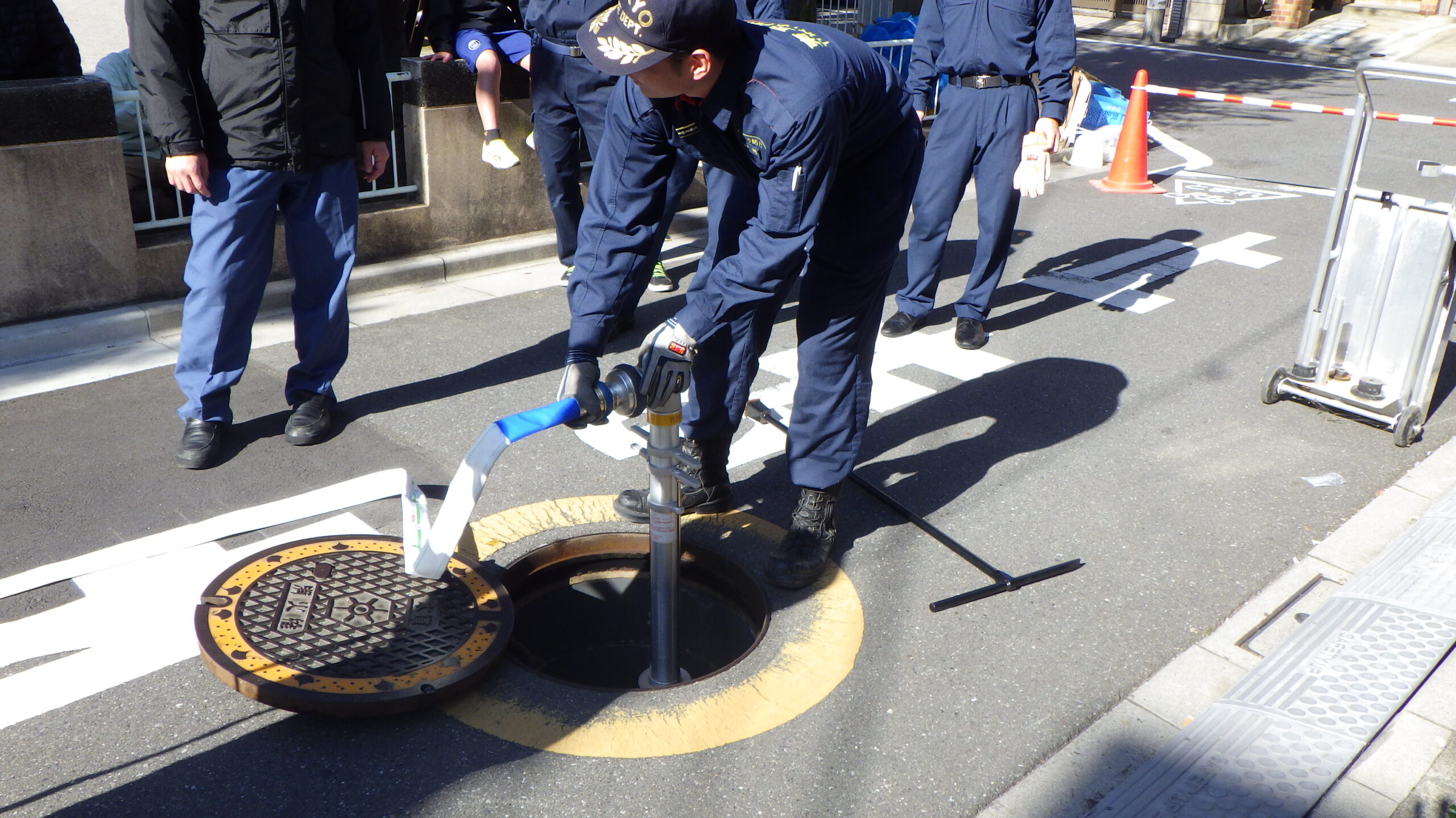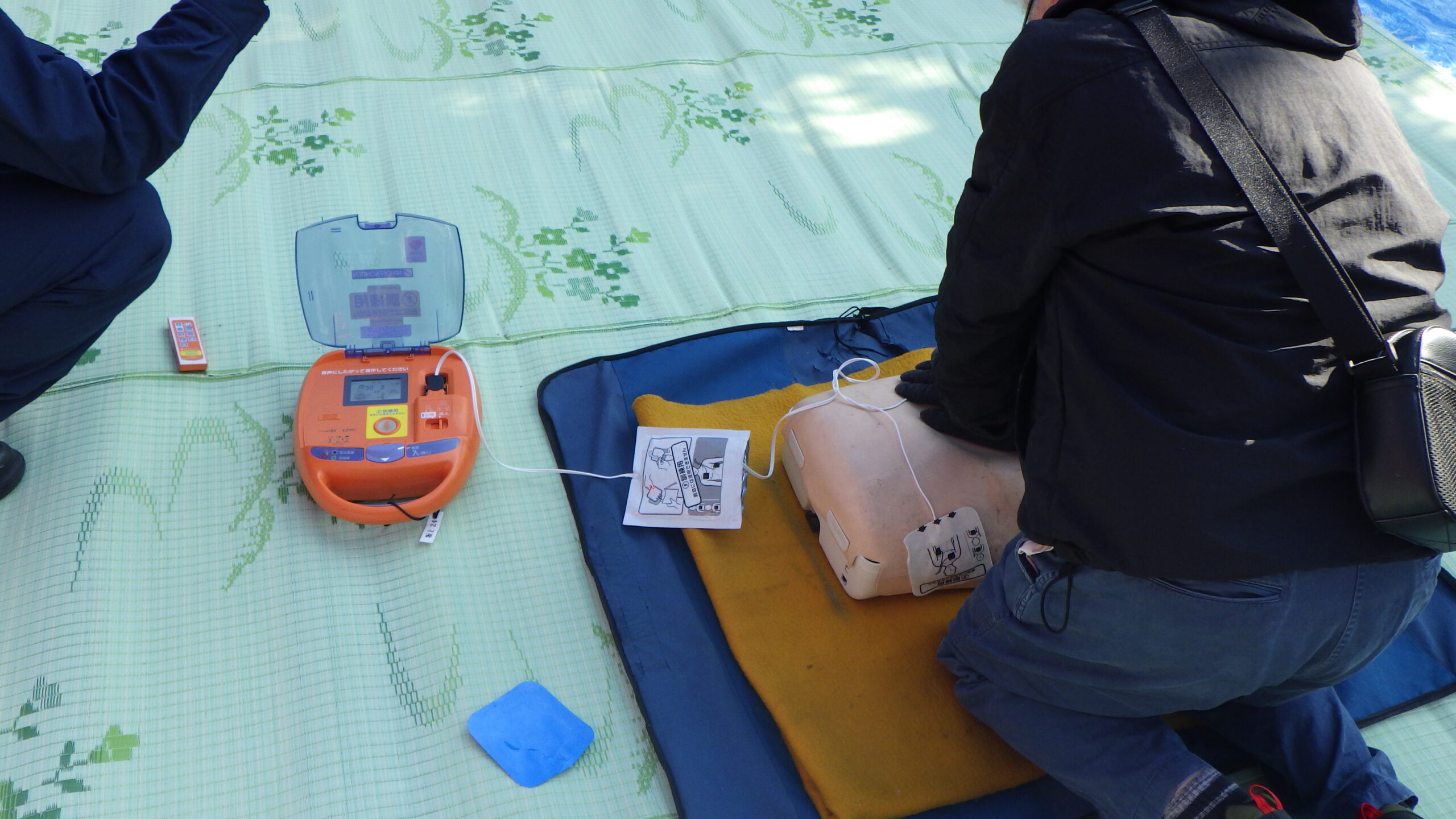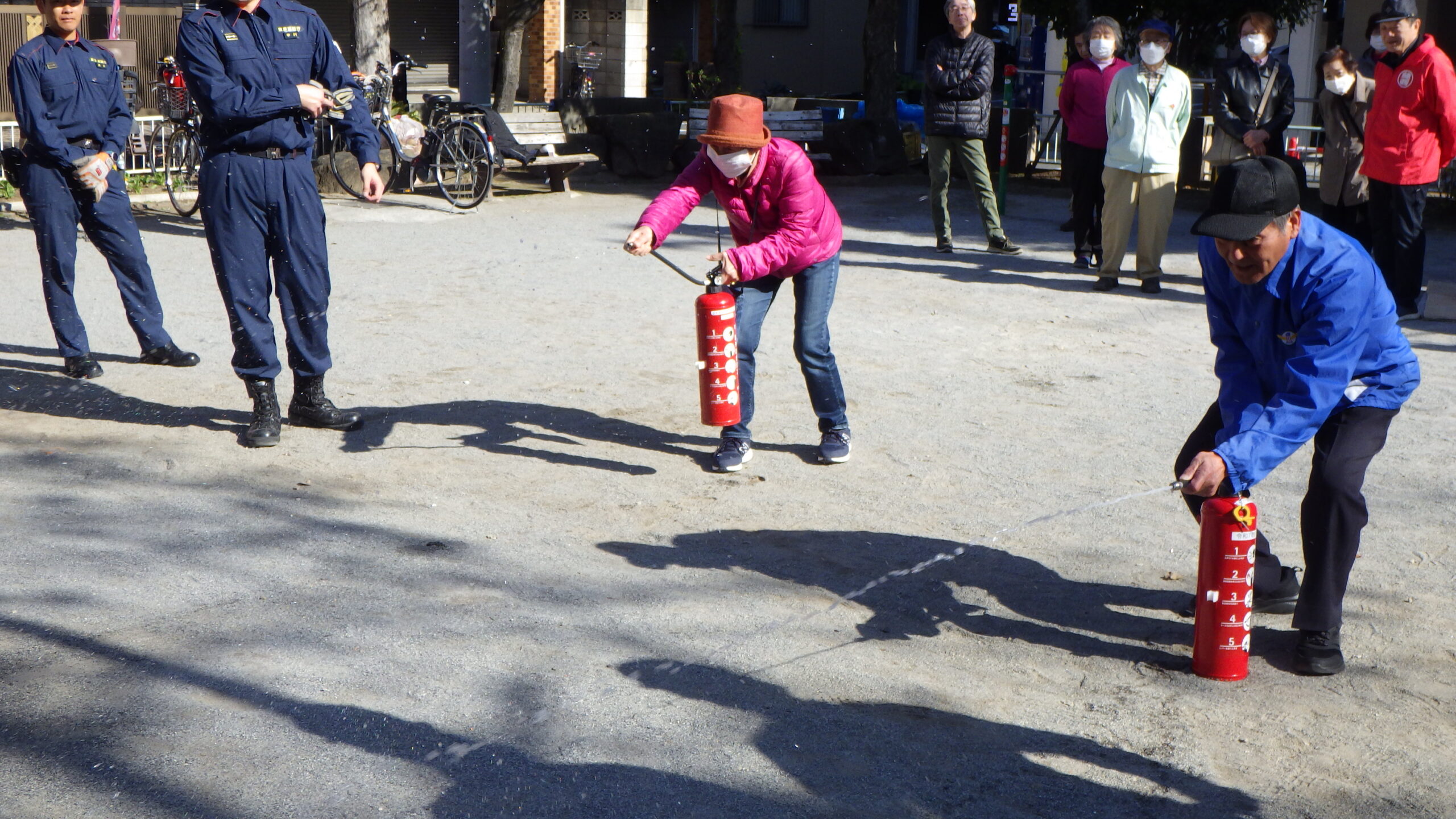 訓練は例年通りのAED(自動体外式除細動器)を使用した応急手当、水消火器を使用した初期消火訓練のほか、本年はスタンドパイプによる放水訓練を実施。これはかなり訓練らしいものでした。