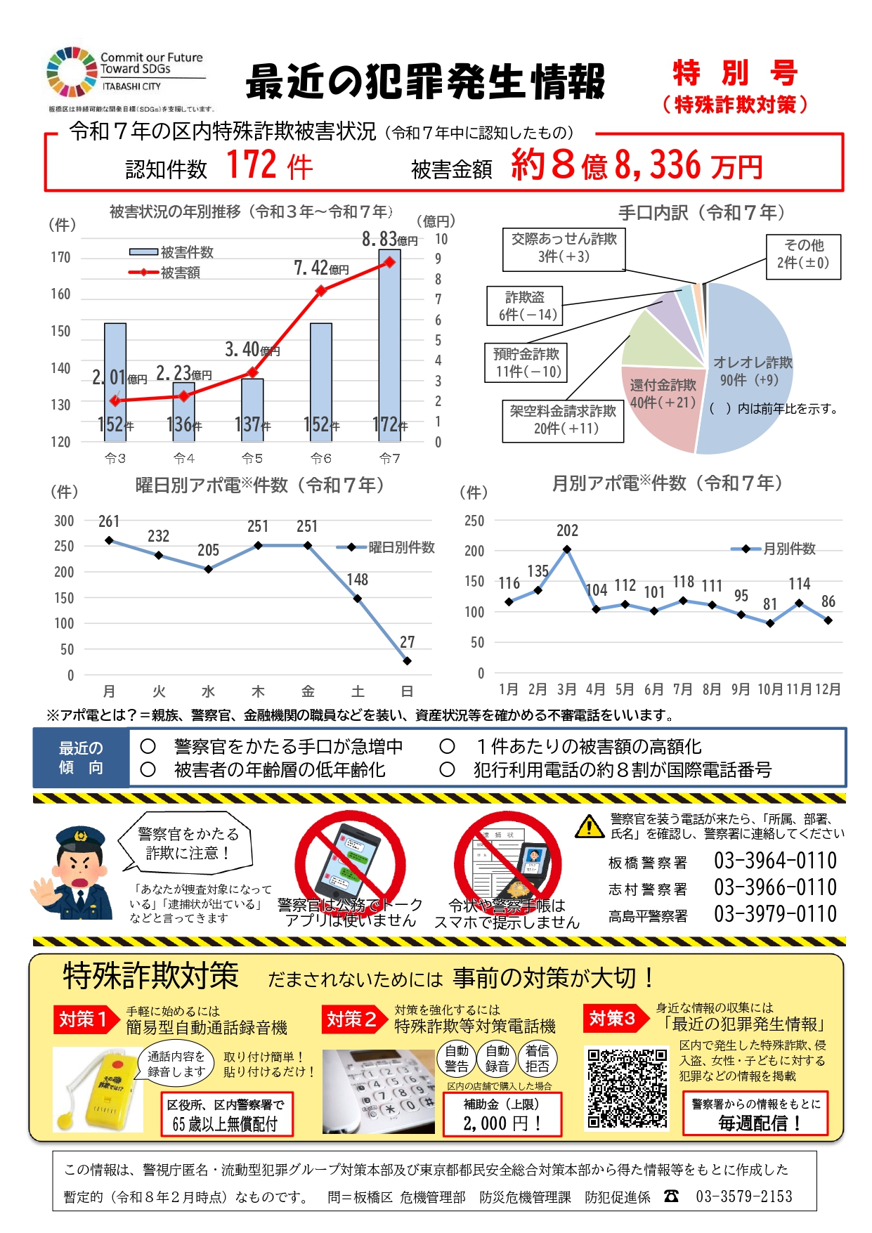 毎週「最近の犯罪発生情報」を掲載していますが、板橋区内の昨年の特殊詐欺被害状況は、172件、金額にして8億8,336万円でした。ここ数年、件数、被害額ともに増加していますが、最近は若い世代の方々の被害も増えているようです。