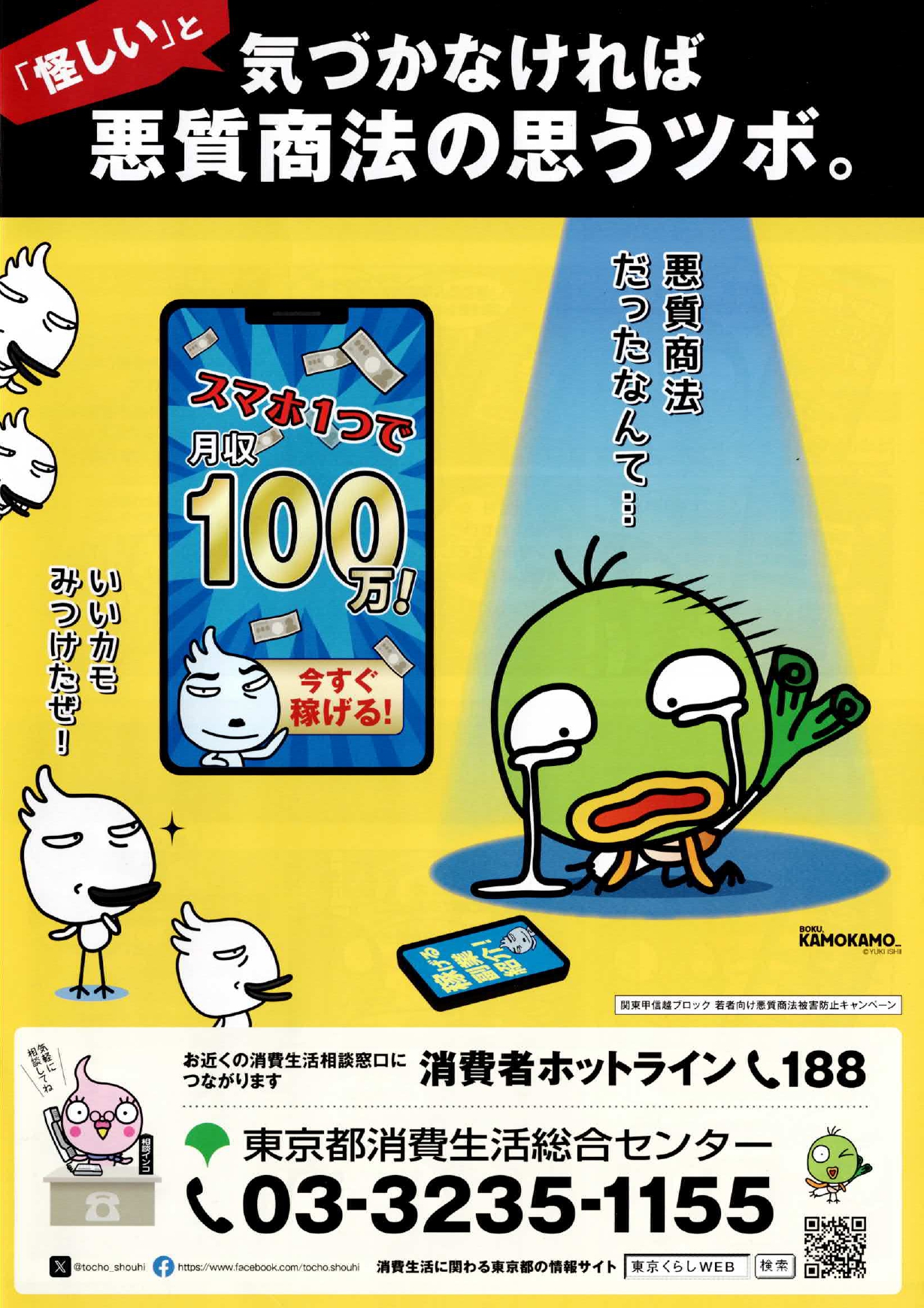 若者や高齢者が狙われやすく、怪しい勧誘にはキッパリと断り、消費者ホットライン(188)や警察(#911)へ相談してください。