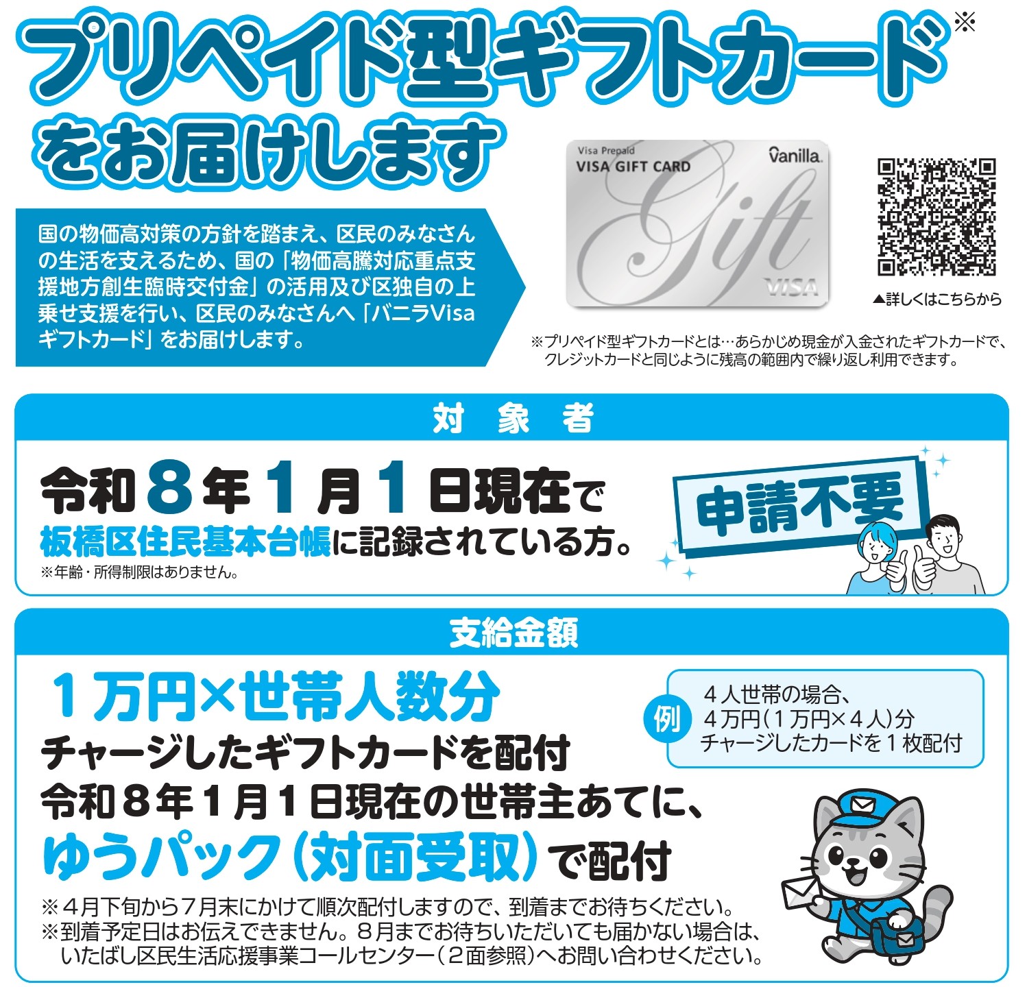 4月11日発行の「広報いたばし」特集号でお知らせがありましたが、国の物価高対策に加え、板橋区独自の上乗せ支援策として、区民のみなさんへ「バニラVisaギフトカード」(1万円×世帯人数分をチャージしたカード)をお届けします。